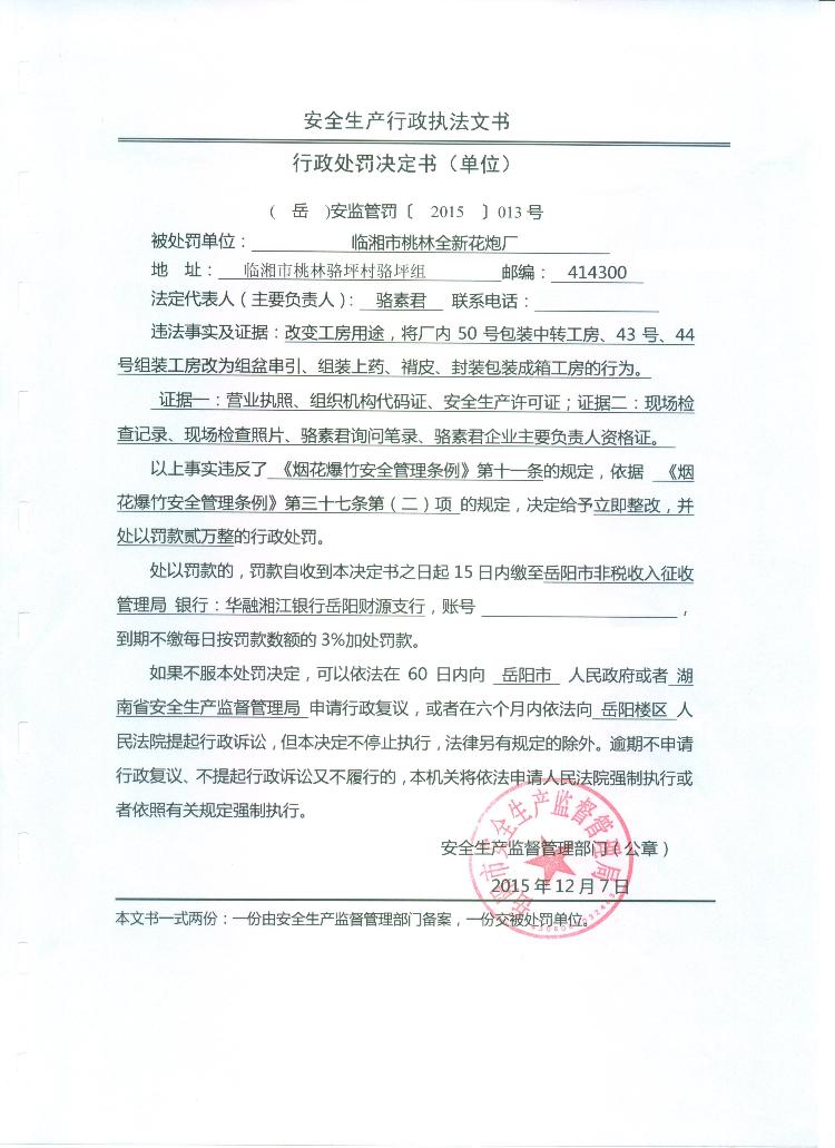 对临湘市桃林全新花炮厂的行政处罚决定