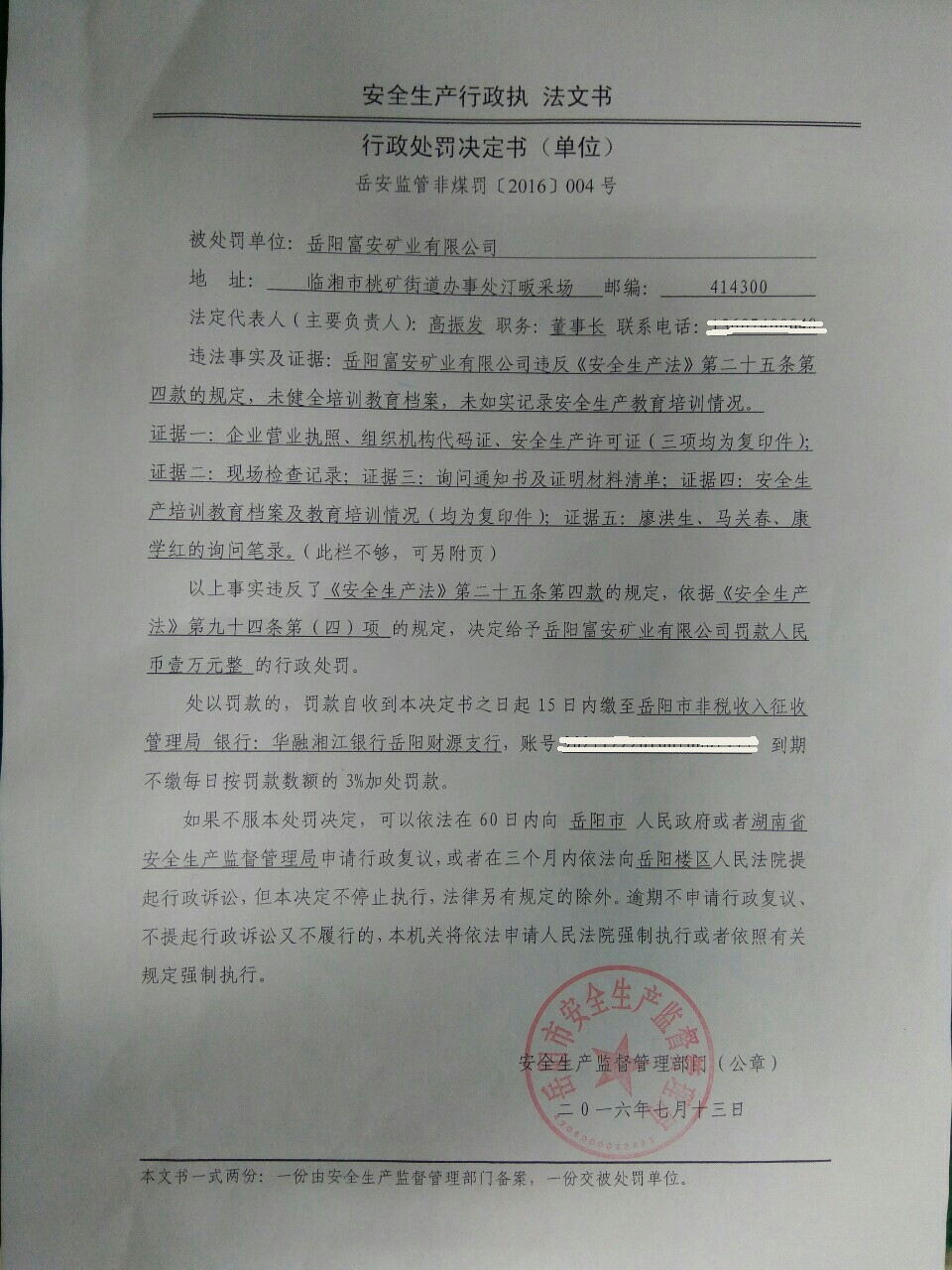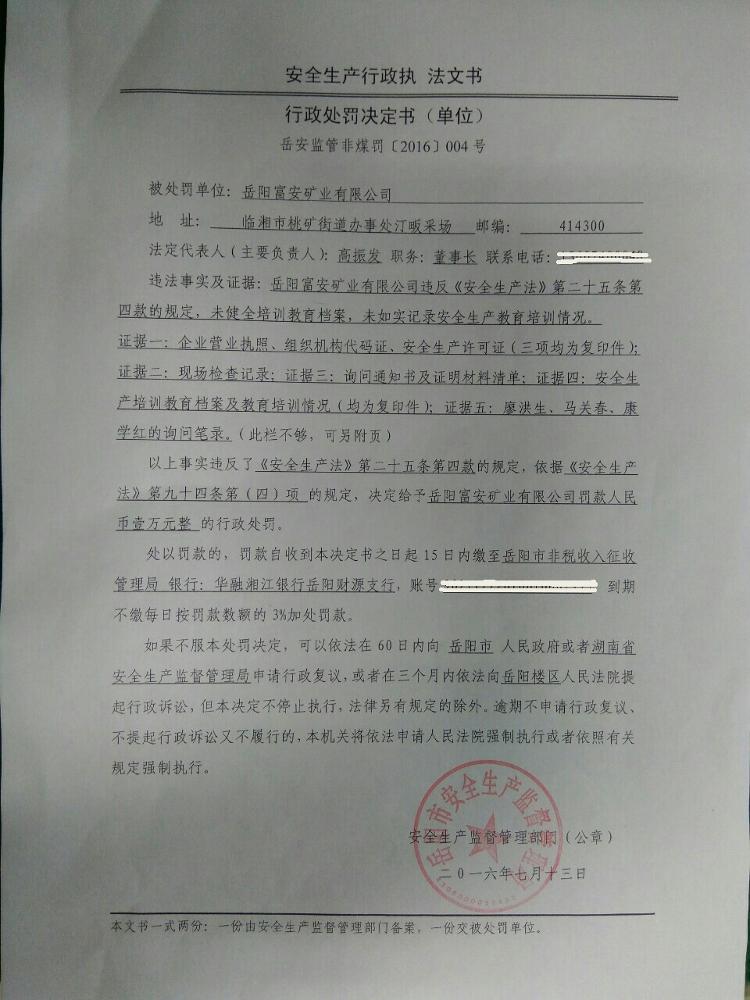 对岳阳富安矿业有限公司的行政处罚