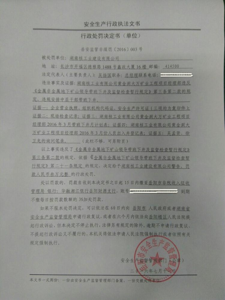 对湖南核工业建设有限公司的行政处罚