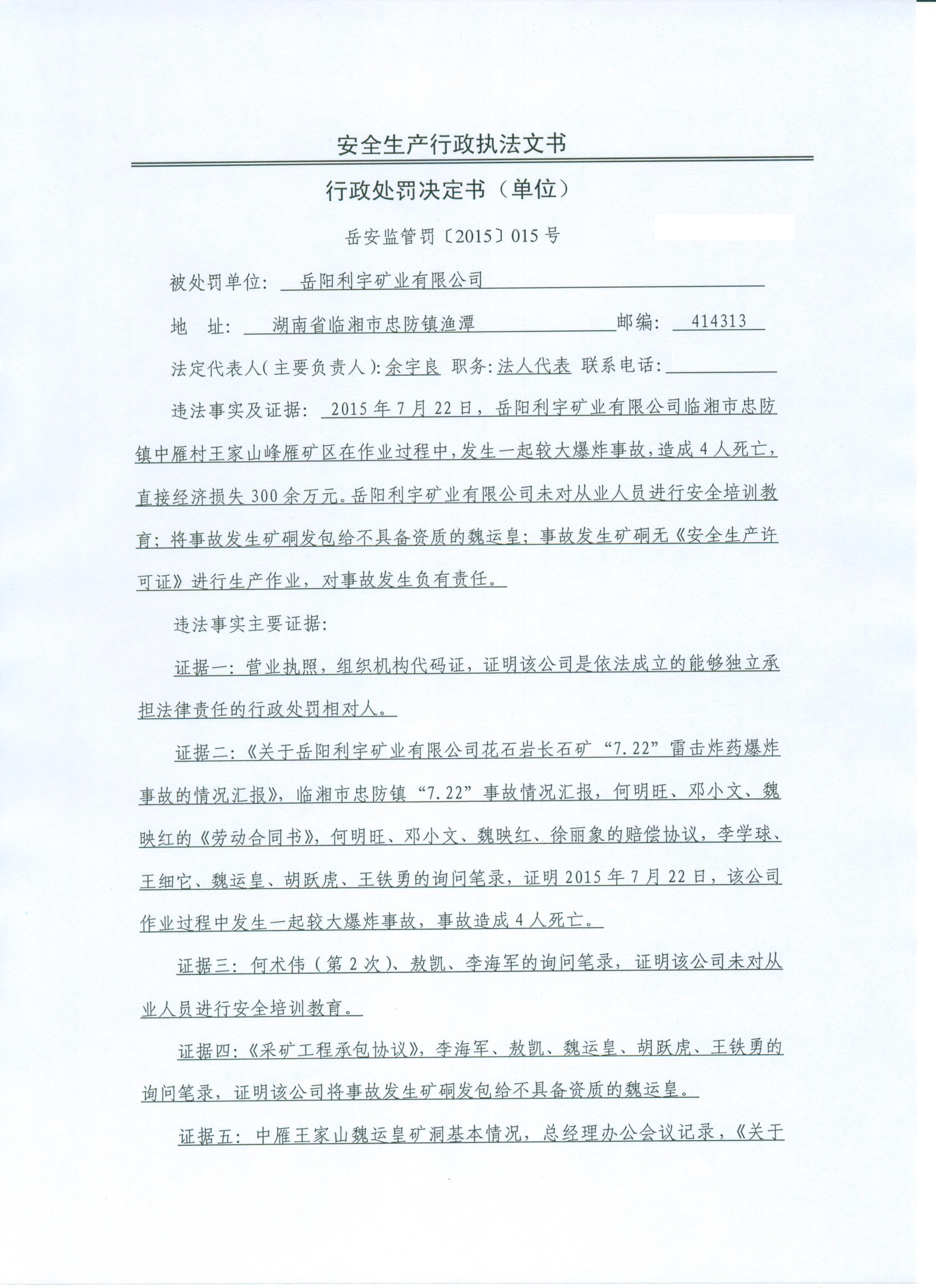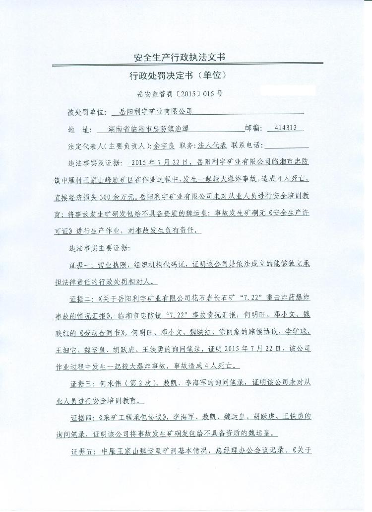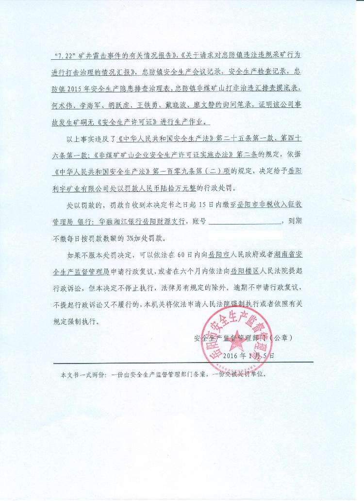 对岳阳利宇矿业有限公司的行政处罚决定
