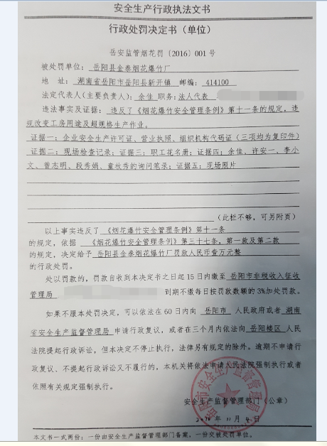 对岳阳县金泰烟花爆竹厂的行政处罚决定
