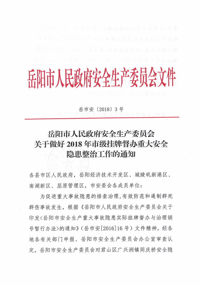 关于做好2018年市级挂牌督办重大安全隐患整治工作的通知