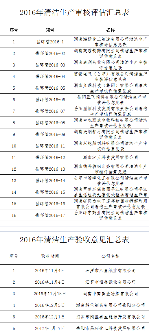 2016年清洁生产审核评估汇总表和2016年清洁生产验收意见汇总表
