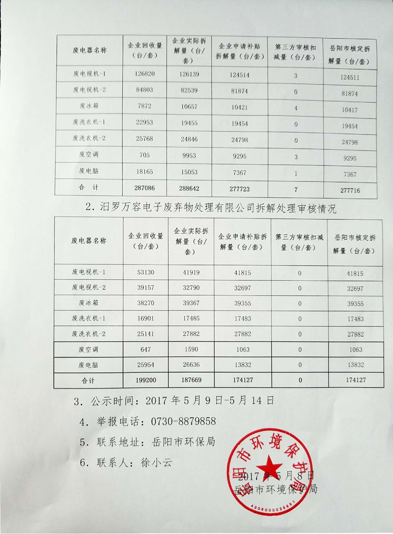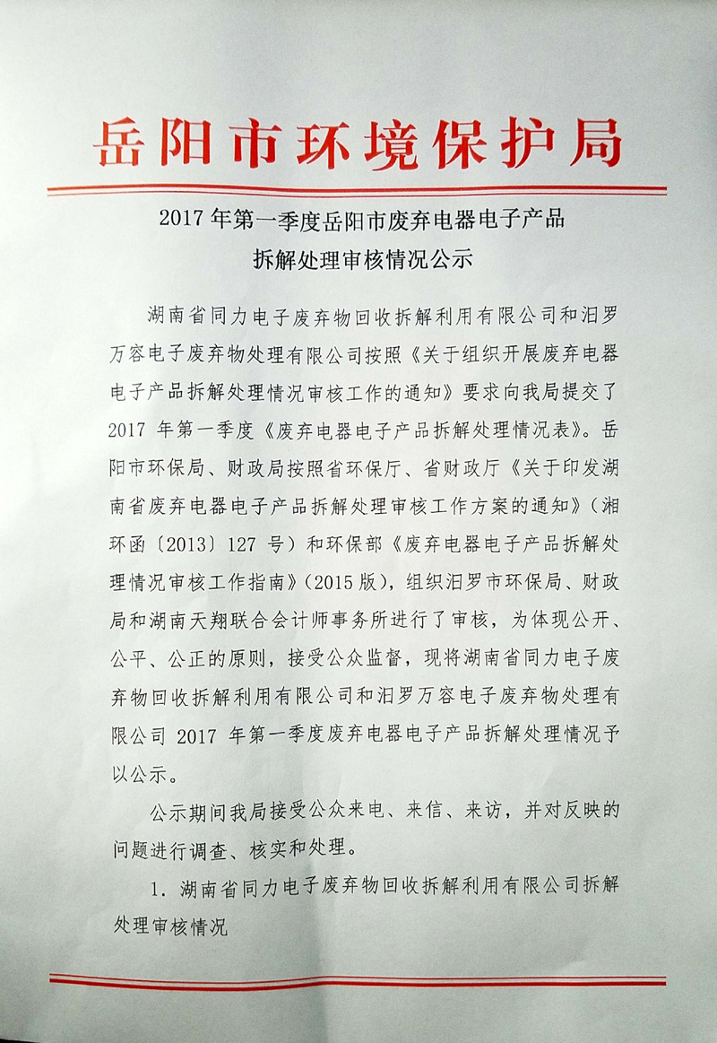 2017年第一季度岳阳市废弃电器电子产品拆解处理审核情况公示