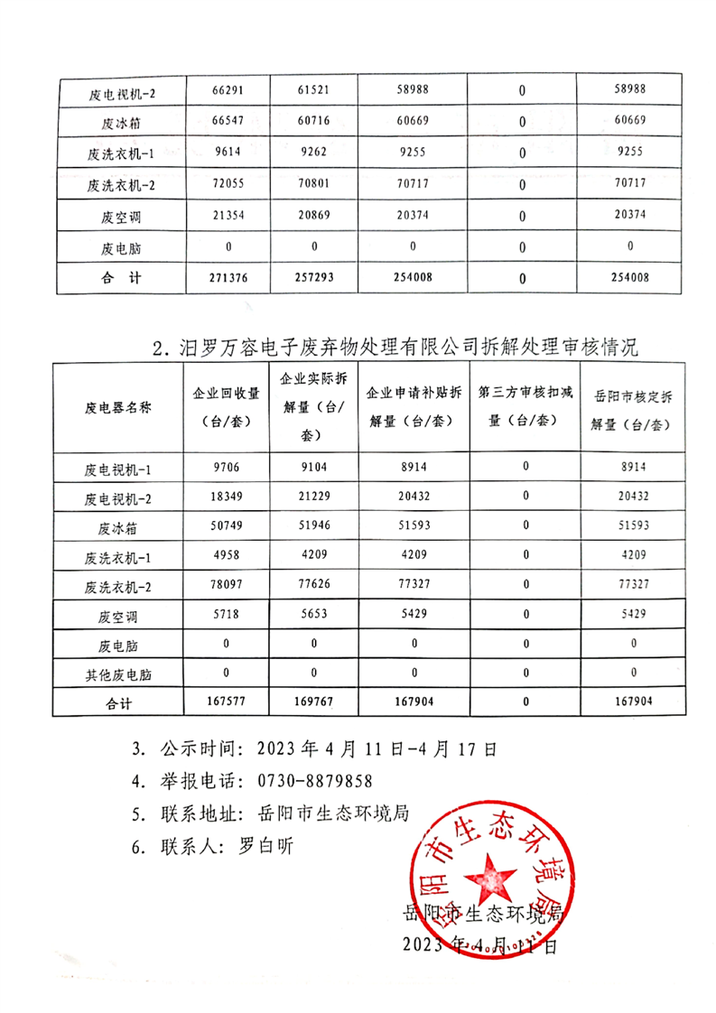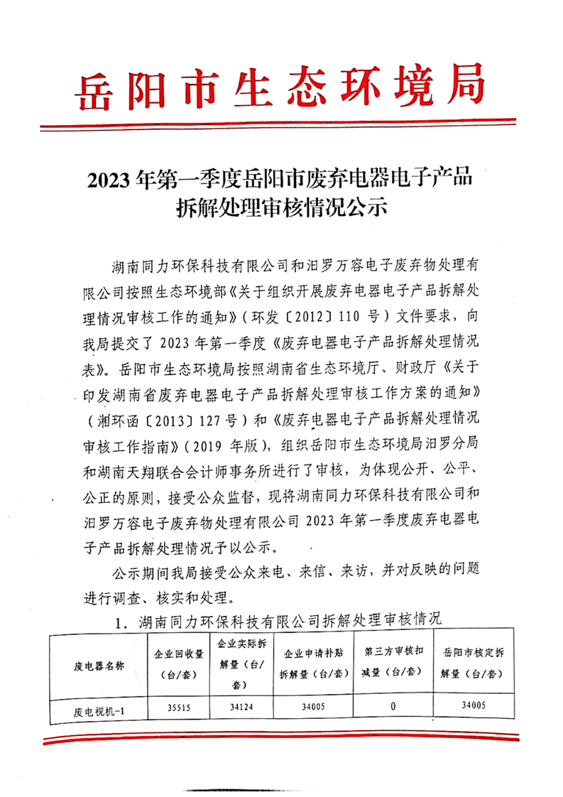 2023年第一季度岳阳市废弃电器电子产品拆解处理审批情况公示