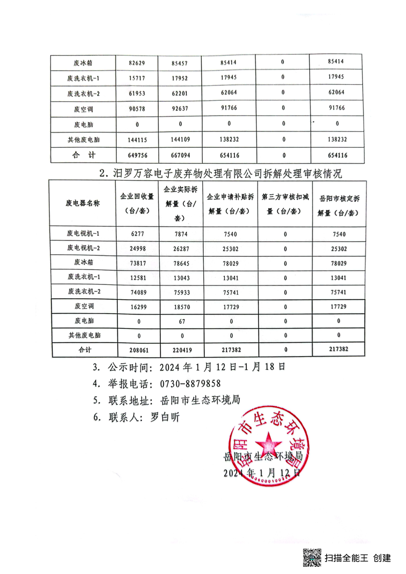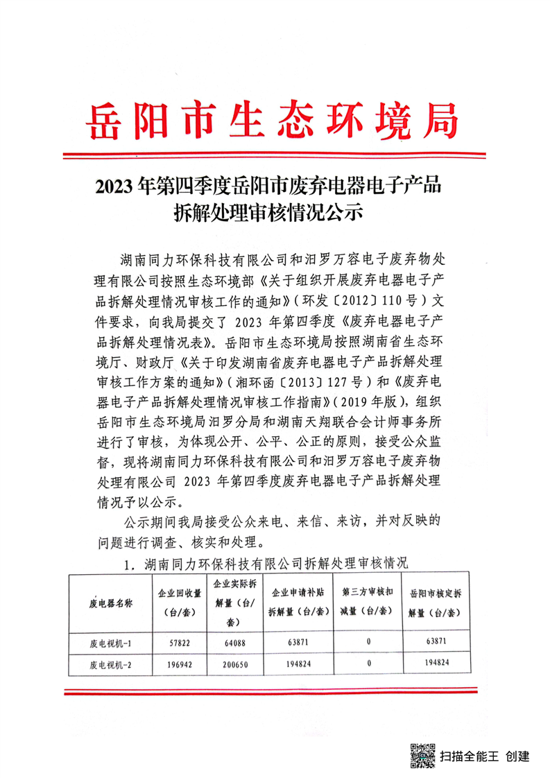 2023年第四季度岳阳市废弃电器电子产品拆解处理审核情况的公示