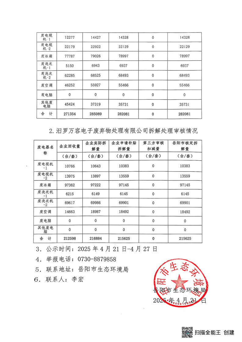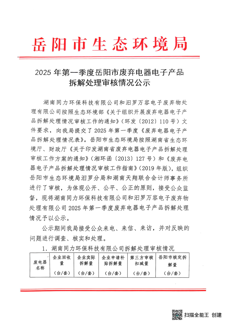 2025年第一季度岳阳市废弃电器电子产品拆解处理审核情况公示