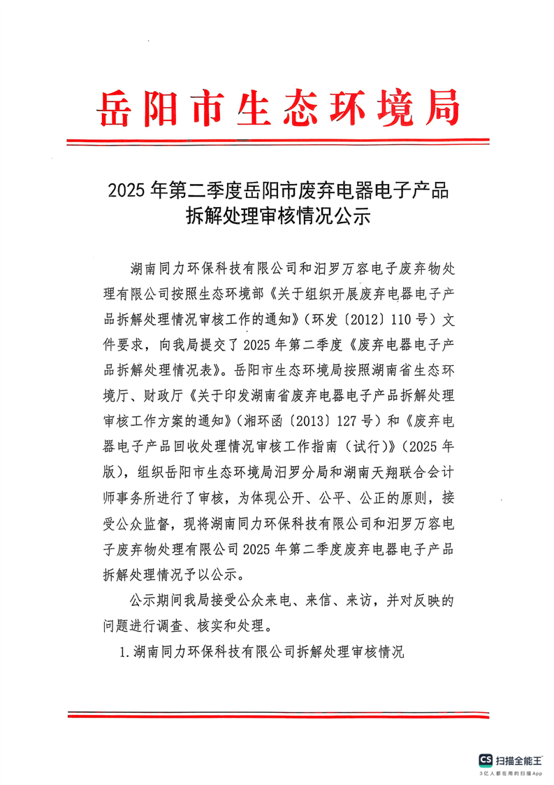 2025年第二季度岳阳市废弃电器电子拆解拆解处理情况公示