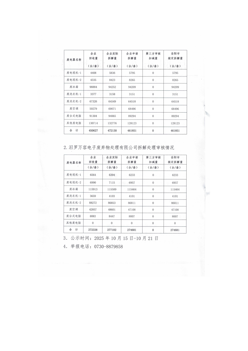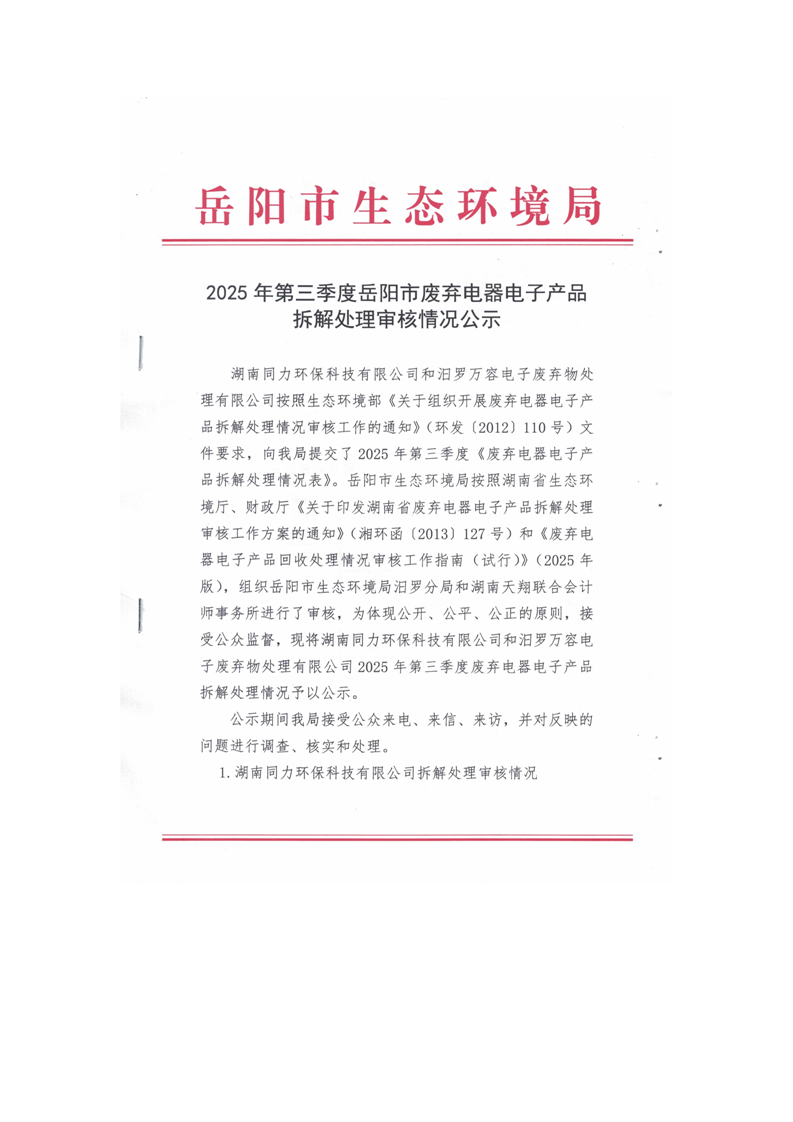 2025年第三季度岳阳市废弃电子产品拆解处理审核情况公示