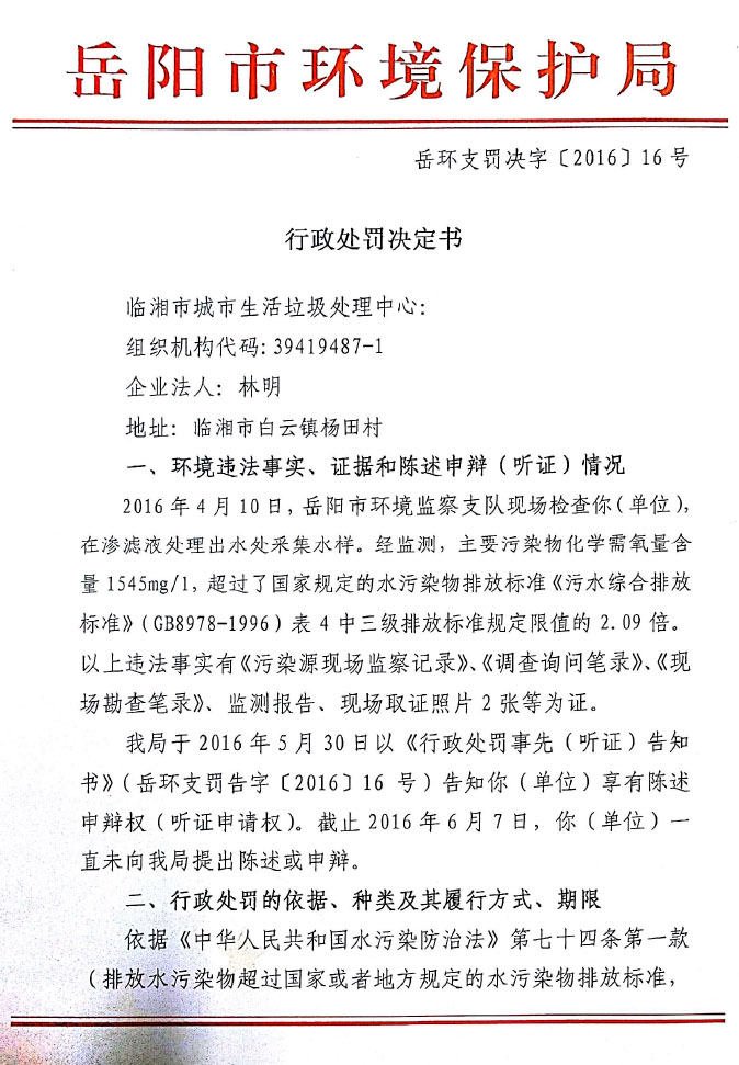 岳环支罚决字〔2016〕16号