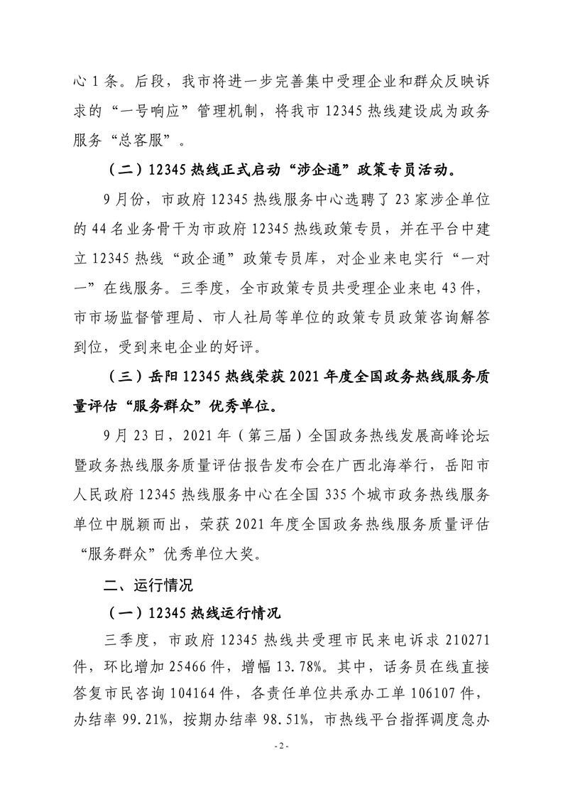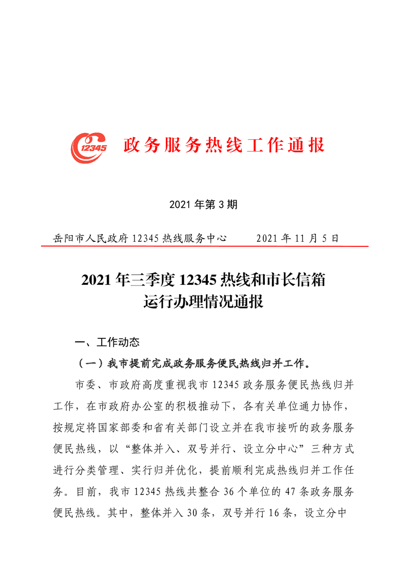 2021年三季度12345热线和市长信箱运行办理情况通报
