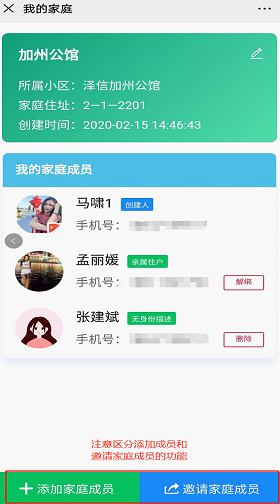 (2)一个家庭有一个人创建家庭即可,有微信的家庭成员通过邀请进行成员添加,不用直接添加,直接添加只是用于没有电话和微信的老人和小孩。如创建了2个以上家庭,将其中一个家庭的家庭成员删除,不用即可。