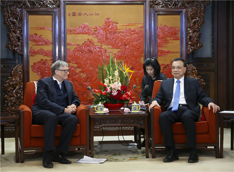 国务院总理李克强11月3日在中南海紫光阁会见美国泰拉能源公司董事长、微软公司创始人比尔·盖茨。