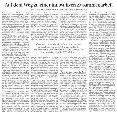 7月7日,在访问德国并主持第五轮中德政府磋商前夕,国务院总理李克强在《法汇报》发表题为《做引领开放与创新合作的好伙伴》的署名文章。全文如下:
