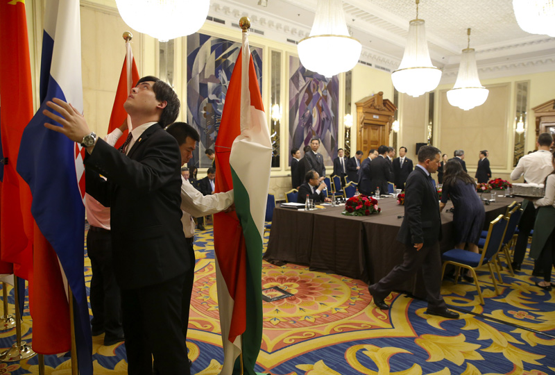 而此刻,与会场一门之隔的房间里,45根旗杆整齐排列,上面分别插着中东欧16国五彩斑斓的国旗。当李克强总理在门口握手送别一位中东欧国家领导人时,工作人员会争分夺秒更换另一国国旗。