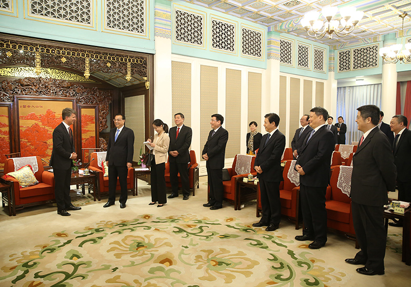 与李克强总理的会见即将结束,德国宝马集团董事长科鲁格从座位起身后仍“意犹未尽”,继续站着与中国总理交流。