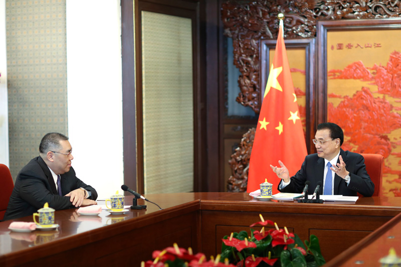 国务院总理李克强12月17日上午在中南海紫光阁会见来京述职的澳门特别行政区行政长官崔世安,听取澳门当前形势和特别行政区政府工作情况的汇报。
