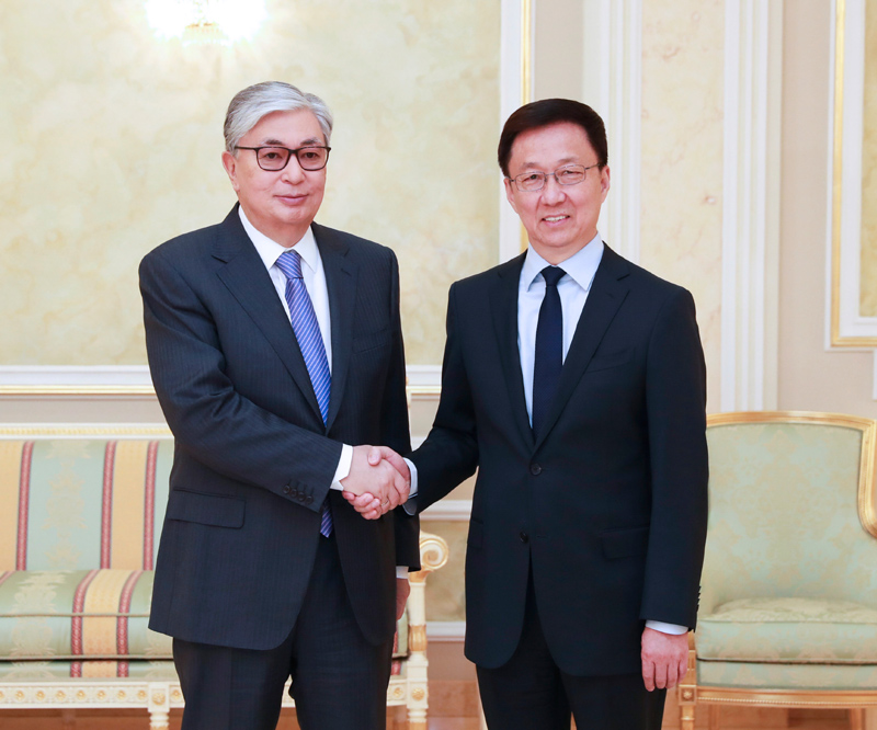 在会见托卡耶夫时,韩正首先转达了习近平主席对托卡耶夫总统的亲切问候。韩正说,在两国元首的战略引领和亲自推动下,中哈全面战略伙伴关系快速发展,双方政治互信日益加深,各领域合作处于历史最好水平,在地区乃至全世界树立了睦邻友好、互利共赢的典范。上个月习近平主席同纳扎尔巴耶夫首任总统举行了富有成果的会晤,向他颁授中华人民共和国“友谊勋章”,向国际社会展现了中哈关系的高水平和特殊性。共建“一带一路”已成为中哈合作主线,双方在发展战略对接、合作机制建设、重大项目推进等方面硕果累累。中方愿与哈方一道,继续深化丝绸之路经济带与“光明之路”新经济政策对接,以产能、贸易、互联互通、农业、高技术、金融合作为优先方向,不断提升中哈合作含金量,更好地造福两国和两国人民。中方祝愿哈方顺利实施“2050战略”,在国家发展事业中不断取得新的辉煌成就。