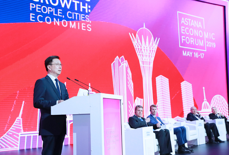 5月16日,中共中央政治局常委、国务院副总理韩正出席在努尔苏丹举行的第十二届阿斯塔纳经济论坛。新华社记者 刘彬 摄