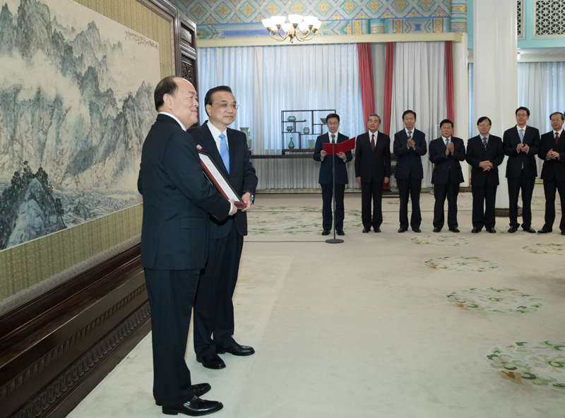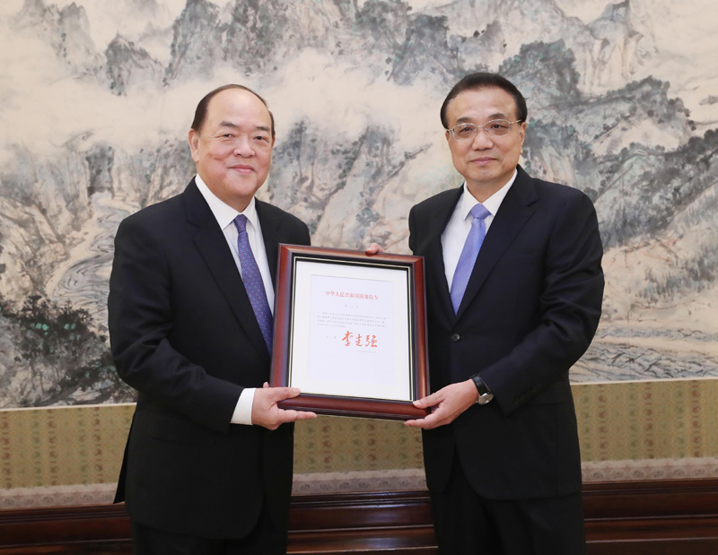 国务院总理李克强9月11日上午在中南海紫光阁会见贺一诚,颁发任命他为中华人民共和国澳门特别行政区第五任行政长官的国务院第719号令。