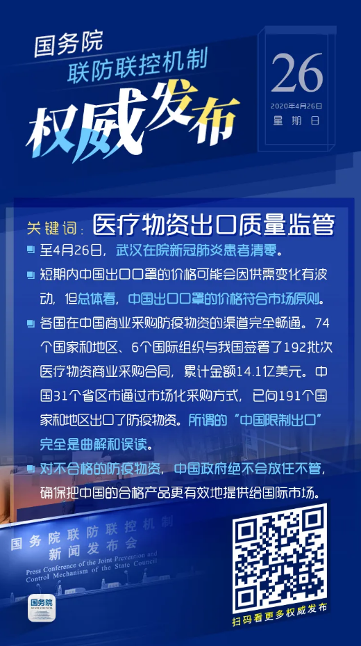 商务部、海关总署、国家市场监督管理总局25日发布《关于进一步加强防疫物资出口质量监管的公告》。《公告》明确,加强非医用口罩出口质量监管。自4月26日起,出口的非医用口罩应当符合中国质量标准或国外质量标准。非医用口罩出口企业报关时须提交电子或书面的出口方和进口方共同声明,确认产品符合中国质量标准或国外质量标准,进口方接受所购产品质量标准且不用于医用用途,海关凭商务部提供的企业清单验放,对不在市场监管总局提供的不合格产品企业清单内的,海关接受申报,予以验放。《公告》还明确,进一步规范医疗物资出口秩序。自4月26日起,产品取得国外标准认证或注册的新型冠状病毒检测试剂、医用口罩、医用防护服、呼吸机、红外体温计的出口企业,报关时须提交书面声明,承诺产品符合进口国(地区)质量标准和安全要求,海关凭商务部提供的取得国外标准认证或注册的生产企业清单验放。
