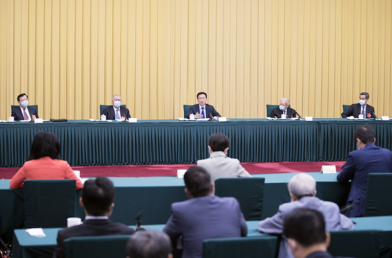 5月23日,中共中央政治局常委、国务院副总理韩正看望出席全国政协十三届三次会议的港澳地区全国政协委员并参加讨论。新华社记者 王晔 摄