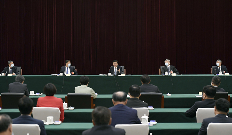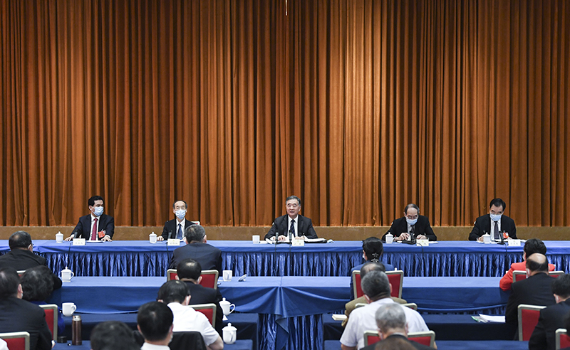 5月23日,中共中央政治局常委、全国政协主席汪洋看望出席全国政协十三届三次会议的民革、台盟、台联界委员并参加讨论。新华社记者 殷博古 摄