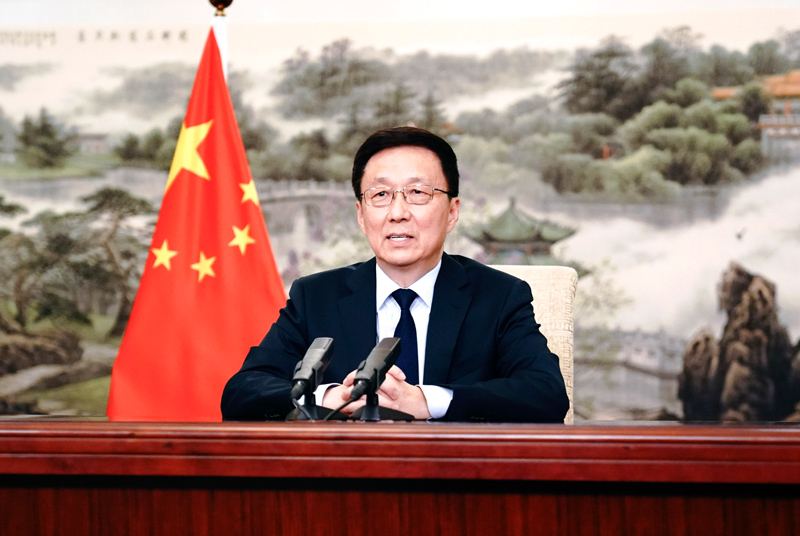 11月10日,博鳌亚洲论坛国际科技与创新论坛首届大会开幕式在澳门举行。中共中央政治局常委、国务院副总理韩正以视频方式发表主旨演讲。新华社记者 丁林 摄