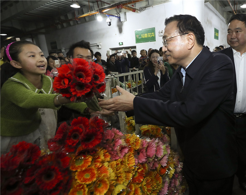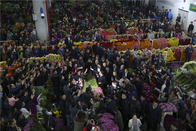 春节将至,昆明斗南花卉市场内鲜花汇成七彩海洋。24日晚,总理意外到访,让这个人头攒动的市场沸腾了。李克强仔细询问鲜花品种价格,关心花农收入,还自掏腰包买了两束花。总理说:“你们起早贪黑、辛苦劳作,给全国人民送去欢乐和吉祥。我祝福你们春节快乐!”