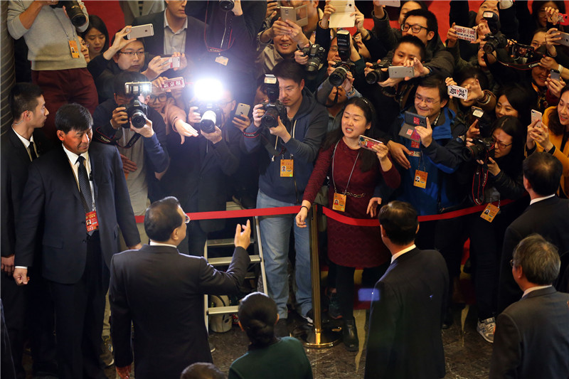 4日下午,李克强走进全国政协经济、农业界委员驻地时,大批“蹲守”记者惊喜之下纷纷举起手机和录音笔,亮出“长枪短炮”,争相向总理提问。李克强在进来和参加完联组讨论离开时,两次在记者队伍前驻足,并回答了几个问题。总理大声说,要对中国经济充满信心!