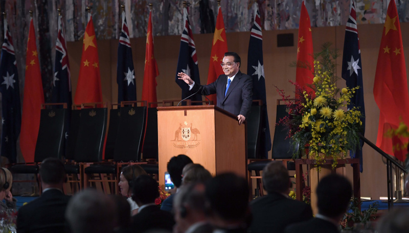 李克强在致辞中表示,中澳关系与合作非常密切。我此访首先是为了推动自由贸易而来。面对经济全球化这个历史潮流,要抓住机会加快发展,在发展中解决遇到的问题。世界各国应充分发挥各自比较优势,在公平竞争与合作中实现双赢共赢。我们愿同澳大利亚加强相关合作,共同向地区和世界展示维护贸易自由化、推进全球化的决心。