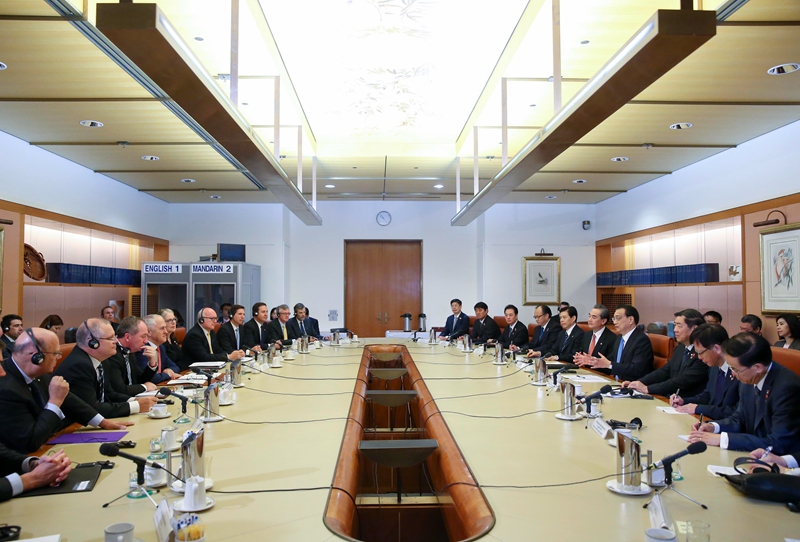 李克强指出,中澳经济优势互补,利益高度交融,合作前景广阔。未来双方应以建立创新、能源、高级别安全三大对话机制为契机,进一步提升两国合作的机制化水平。以建设双边自贸协定、发展战略对接、科技创新、区域经济合作四大合作平台为重点,积极拓展合作领域,探讨新业态和新商业模式合作。双方应做好中澳自贸协定审议工作,在服务贸易和投资领域进行深入探讨,在更多领域开展自由贸易,推动中澳迈向自贸繁荣时代,共同推进经济全球化和贸易投资自由化便利化,反对贸易保护主义,推动构建开放型世界经济。