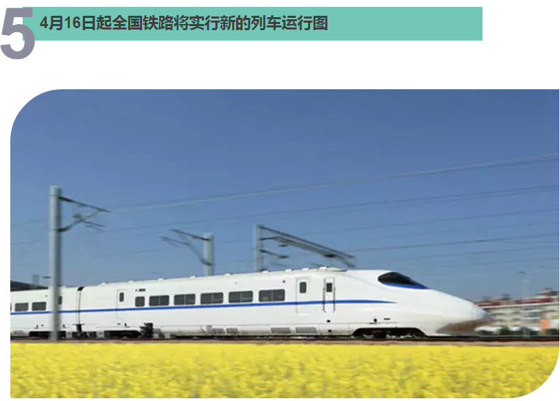 4月16日零时起,全国铁路将实行新的列车运行图,较调整前增开动车组列车25.5对。运行图调整后,全国铁路开行旅客列车总数达3615对。调图后,铁路部门将扩大沪昆高铁、杭深线、南广、贵广、宁蓉、京广等客流饱满线路的运力,增开动车组列车25.5对,并安排37对现有动车组列车重联或大编组运行。同时为了配合此次列车运行图的调整,4月14日及以后始发的旅客列车车票定于3月21日起开始发售。