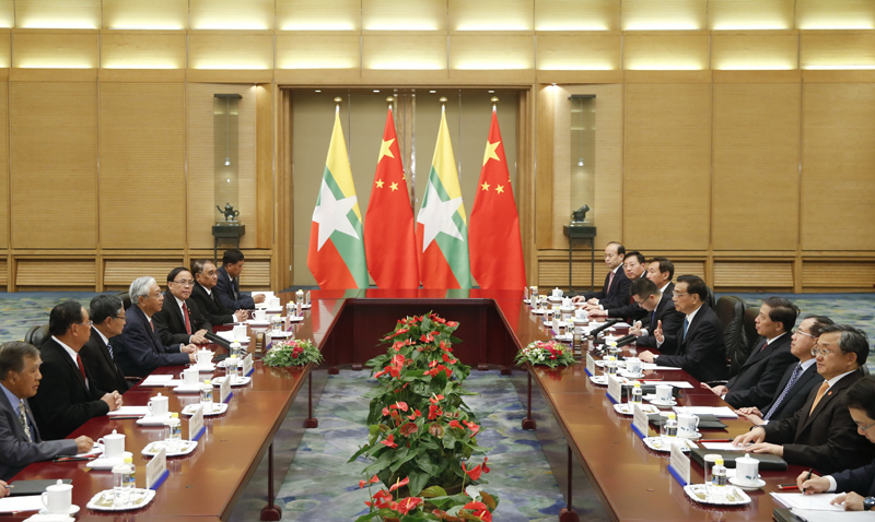 李克强表示,中缅是友好邻邦,两国人民有着深厚的“胞波”情谊。习近平主席同你举行富有成果的会谈,有力推动两国关系与合作向前发展。中国支持缅甸走符合自身国情的发展道路,愿坚持两国友好合作的大方向,保持高层交往,推进各层级交流与各领域合作,不断为中缅关系发展注入新动力。