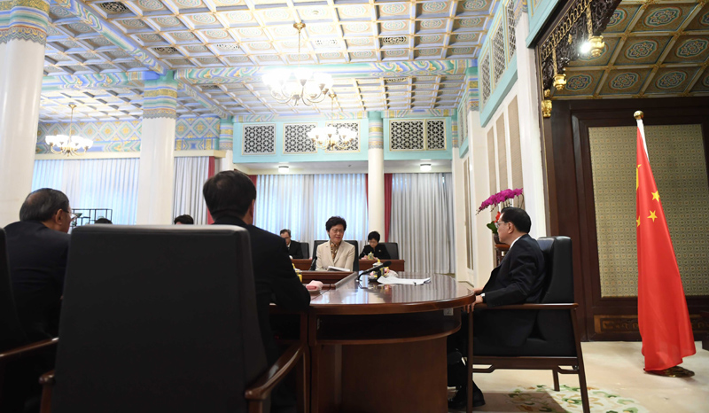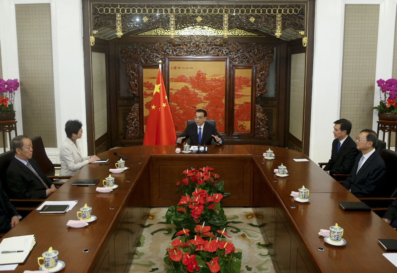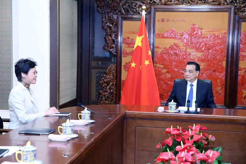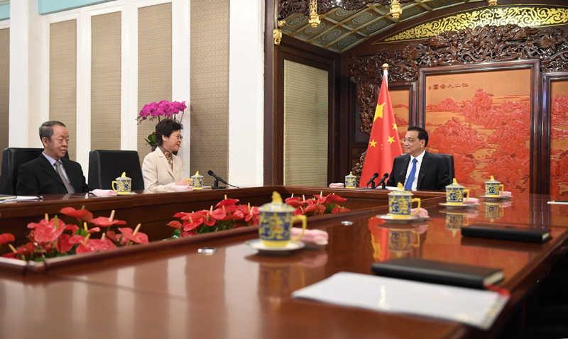 李克强首先祝贺林郑月娥当选香港特区第五任行政长官。李克强表示,中央政府全力支持你和新一届特区政府的工作,全力支持香港发展经济、改善民生、推进民主、促进和谐,加强与内地交流合作。香港的发展既是自身的需要,也是国家的需要。今年,中央政府要研究制定粤港澳大湾区发展规划,将推出内地和香港之间的“债券通”,目的就是进一步密切内地与香港的交流合作,继续为香港发展注入新动能。只要有利于香港繁荣稳定、有利于内地和香港互补互利、有利于巩固和提升香港三大中心地位的措施,中央政府都将一如既往予以支持。