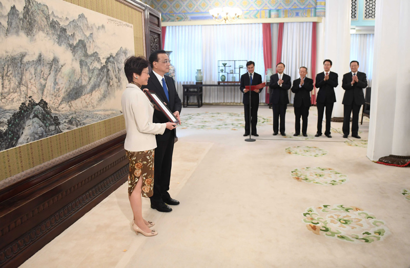 国务院总理李克强4月11日上午在中南海紫光阁会见林郑月娥,颁发任命她为中华人民共和国香港特别行政区第五任行政长官的国务院第678号令。