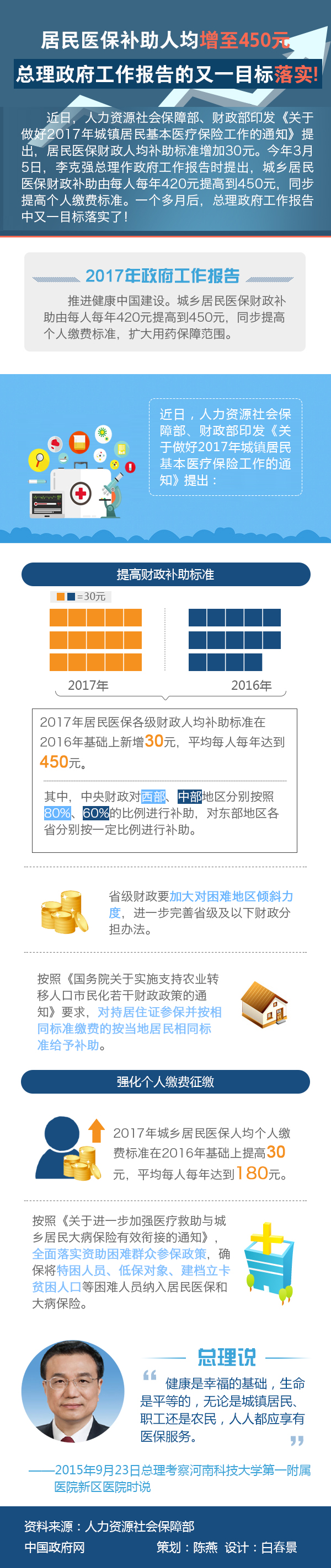 近日,人力资源社会保障部、财政部印发《关于做好2017年城镇居民基本医疗保险工作的通知》提出,居民医保财政人均补助标准增加30元。今年3月5日,李克强总理作政府工作报告时提出,城乡居民医保财政补助由每人每年420元提高到450元,同步提高个人缴费标准。一个多月后,总理政府工作报告中又一目标落实了!
