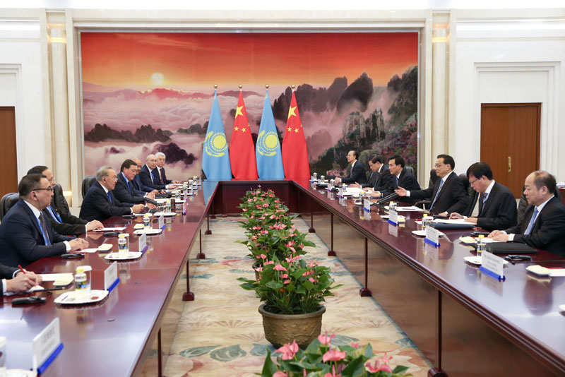 国务院总理李克强5月14日下午在人民大会堂会见来华出席“一带一路”国际合作高峰论坛的哈萨克斯坦总统纳扎尔巴耶夫。