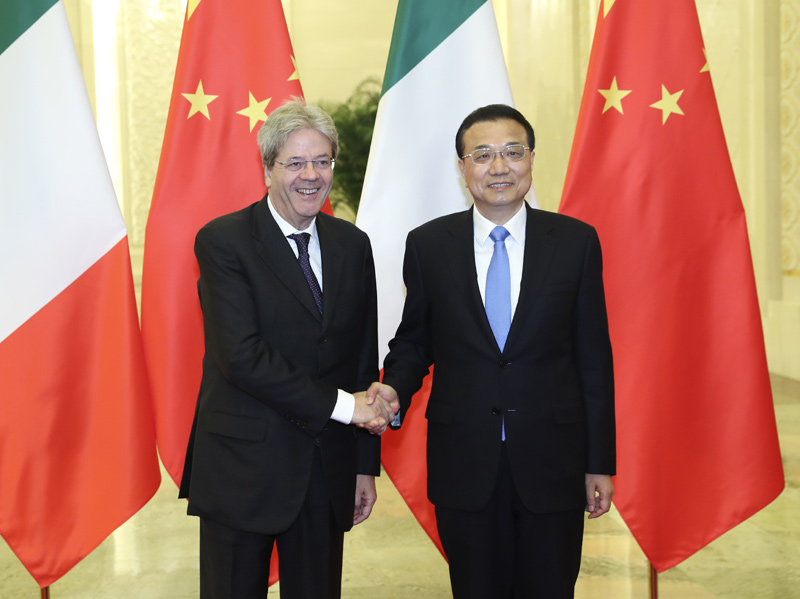 李克强与意大利总理真蒂洛尼亲切握手(新华社 庞兴雷 摄)