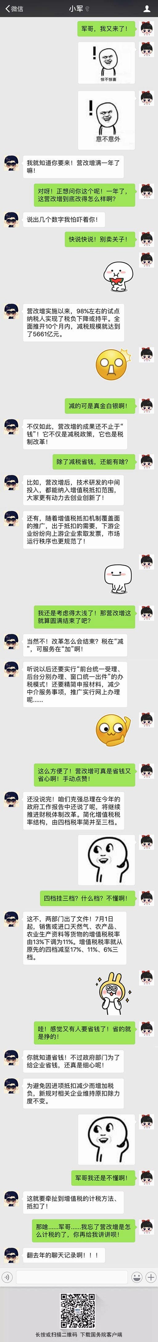 到今年5月1日,营改增试点全面推开已整整一年。一年来,营改增减税效应如何?今后又如何深入推进这项改革?一无所知的小白又来请教税务达人小军了!一起看看他们又聊了啥?