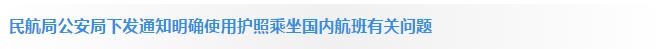 5月23日,民航局公安局专门下发通知,进一步明确旅客使用护照乘坐国内航班的相关问题。通知指出,中华人民共和国护照可以作为有效乘机身份证件,办理国内航班购票、值机、安检手续;旅客乘坐国内航班,办理购票、值机、安检手续时,应当使用同一个有效乘机身份证件。