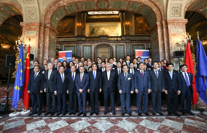 当地时间2日上午,李克强总理在布鲁塞尔出席第十二届中欧工商峰会并发表演讲后,在欧盟委员会主席容克陪同下,与参加第三次中欧创新合作对话的主要代表合影。