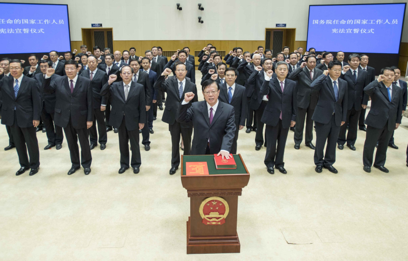 领誓人站在宣誓台前,左手抚按《中华人民共和国宪法》,右手举拳宣读誓词。其他宣誓人列队站立,举起右拳跟诵誓词。李克强总理监誓。