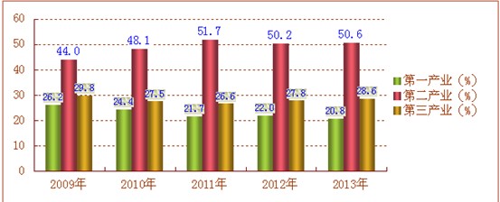 一、二、三产业结构为20.8:50.6:28.6,第一产业所占比重比上年比重降低1.2%;第二产业所占比重上升0.4个百分点;第三产业比上年上升0.8个百分点。
