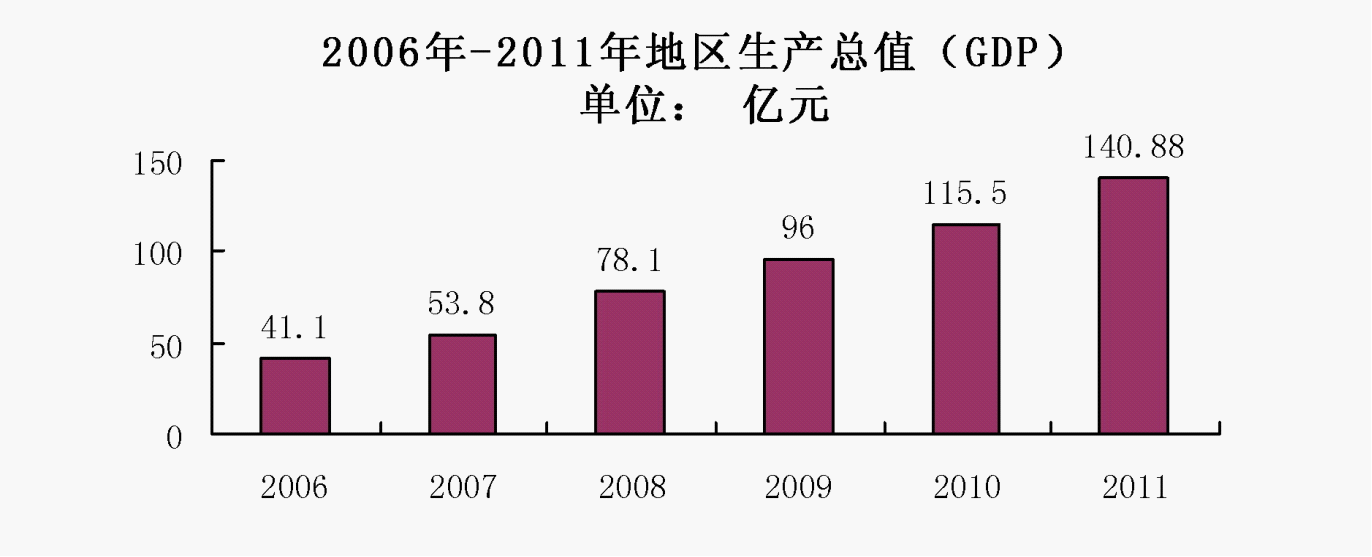 初步核算,全年市内生产总值140.88亿元,比上年增长14.3%。其中,第一产业增加值22.32亿元,增长3.6%;第二产业增加值80.40亿元,增长17.7%;第三产业增加值38.16亿元,增长14%。第一产业增加值占市内生产总值的比重为15.8%,第二产业增加值比重为57.1%,第三产业增加值比重为27.1%。