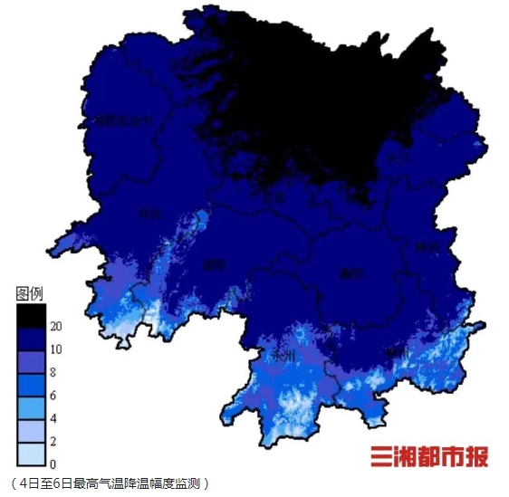 今日,湖南省气象台称,10月4日开始,湖南出现一轮强冷空气过程。截至5日20时,全省最高气温平均下降15.7℃,湘北、湘中的30个县市区最高气温降幅超过20℃,常德澧县降幅最大达24.3℃。