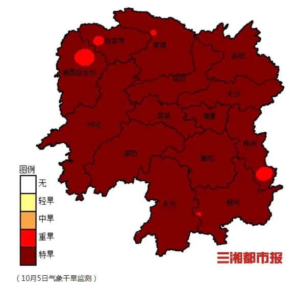 截至10月5日,湖南122个县市区均达到重旱以上等级,其中117个县市区达到特旱。39个县市区连续特旱日数超30天,最长为新邵58天,其次为慈利55天。