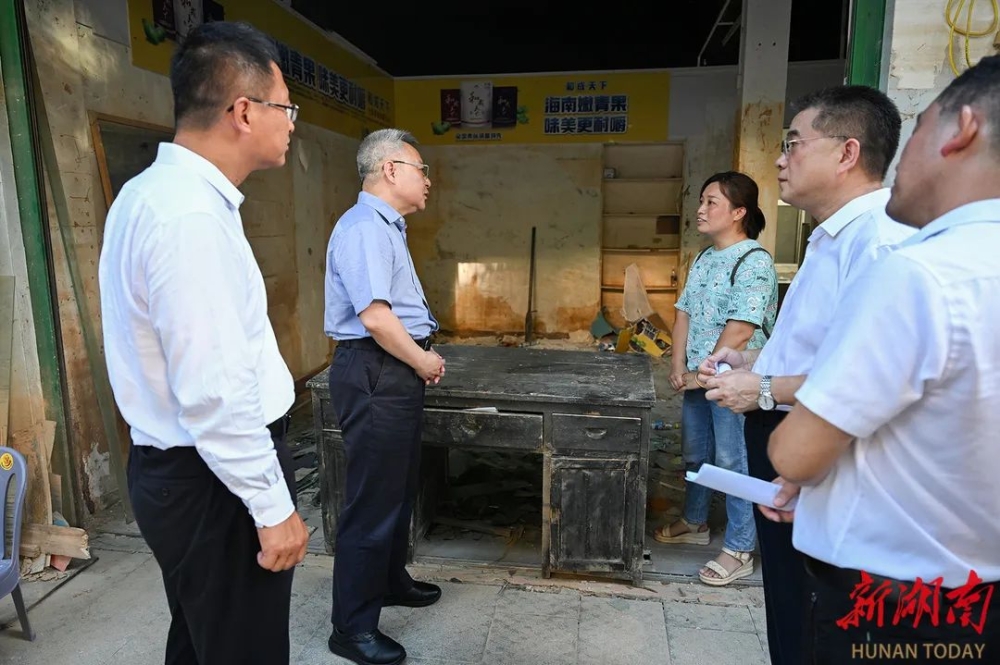 今年7月1日,平江县遭遇特大洪涝灾害,县城近一半面积被淹,25个乡镇(街道)中有14个乡镇(街道)被淹。位于平江县中心城区的大桥西路共有1400多栋房屋、400多家商铺被淹。沈晓明沿街步行察看商铺情况,了解清淤、除险、消杀等情况。沈晓明还走进启明中学,察看校舍、食堂、操场恢复情况,听取学校清理整修进展情况。