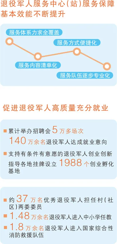 “‘十四五’退役军人服务和保障规划,是退役军人事务领域首部国家级专项规划。规划实施以来,我们认真抓好贯彻落实,各项工作都达到了预期。”退役军人事务部部长裴金佳表示,“退役军人安置率等约束性指标全部如期实现,退役军人服务中心(站)、烈士纪念设施建设等预期性指标稳步落实,有的超额完成,有效提升了退役军人服务保障水平。”退役军人服务中心(站)是党和政府密切联系、团结凝聚广大退役军人的桥梁和纽带。“‘十四五’以来,退役军人事务部高度重视服务中心(站)建设,不断提升服务保障基本效能。”裴金佳介绍。服务体系上力求全覆盖。进一步健全从国家到村(社区)的6级服务中心(站)建设,现有61万个服务机构。同时,还在有条件的高校、企业、商圈建立服务站点,就近就便为退役军人提供日常服务。服务内容上实行清单化。根据退役军人需求,建立职责明确、相互衔接、规范有序的服务清单。服务方式上实现便捷化。组织推进退役军人服务APP建设,不断丰富完善服务功能,通过信息化赋能服务流程,提高服务水平。 服务队伍上逐步实现专业化。设立退役军人事务员新职业,定期开展对服务人员的业务培训、交流见学、技能竞赛,不断提高工作中的服务能力和水平。“我们将进一步推进服务中心(站)和基层治理的深度融合、与公共服务机构协调配合,不断拓展服务功能和职责,为退役军人提供更加精准、便捷、优质、高效的服务。”裴金佳表示。退役军人为国防和军队建设奉献了青春、作出了贡献。对于困难退役军人,退役军人事务部积极探索各种关心帮扶的措施办法。“十四五”时期,按照普惠和优待叠加原则,出台困难退役军人帮扶援助工作规范、加强退役军人司法救助等文件,对困难帮扶援助作出明确规定和要求;搭建困难退役军人帮扶信息化服务系统,定期和民政部门比对数据;会同相关部门和社会组织开展“情暖老兵”专项行动,切实解决退役军人实际困难。裴金佳表示,要切实提升帮扶援助工作及时性精准性,努力做到呼有所应、难有所帮、弱有所扶,积极帮助困难退役军人渡过难关。“我们坚持把促进退役军人高质量充分就业作为头等大事,引导他们成为各行各业的生力军,为经济社会发展贡献力量。”退役军人事务部就业创业司负责人盛保晨说。盛保晨介绍,退役军人事务部先后与69家央企、国企和大型民企签约,带动各级退役军人事务部门与全国近2万家企业合作,引导企业落实“同等条件下优先招用退役军人”“适当放宽学历、年龄等条件”优惠政策;每年组织退役军人就业服务专项行动,累计举办招聘会5万多场次,140万余名退役军人达成就业意向;支持有条件有意愿的退役军人创业创新,指导各地挂牌设立1988个创业孵化基地。在发挥退役军人作用上,退役军人事务部加强“兵支书”“兵教师”“国防教育辅导员”等培育,推动开展消防员专项招录,引导退役军人继续为国家作贡献。约37万名优秀退役军人担任村(社区)两委委员,1.48万余名退役军人进入中小学任教,1.8万余名退役军人进入国家综合性消防救援队伍。“‘十四五’期间,转业安置工作始终坚持一条主线,就是坚持把退役军人接收安置好、作用发挥好。”退役军人事务部副部长徐耀说。徐耀介绍,退役军人事务部不断盘活岗位和人才“两个资源”,调动党政机关、群团组织、事业单位、国有企业的安置积极性,优化各类单位的安置比例,引导各单位拿出更多适合退役军人的岗位,实现“人岗相适、人尽其才”;推进专业人才直通安置,“盘活用好”科研类、飞行类等通用人才,实现“转业不转岗”,截至目前,直通安置了8000余人。“我们将继续完善安置政策制度体系,着力抓好加大岗位供给、优化安置程序、强化服务管理3个重点,不断推进安置工作高质量发展。”徐耀表示。英雄烈士是民族最闪亮的坐标,他们的事迹和精神是国家的宝贵财富。“‘十四五’期间,退役军人事务部门把宣传英烈事迹、弘扬英烈精神作为重要抓手,持续推动全社会崇尚英雄、缅怀先烈、争做先锋。”退役军人事务部思想政治和权益维护司司长陈二伟介绍。深情缅怀革命先烈。评选公布了第七批国家级烈士纪念设施。“十四五”期间,迎回了4批265位在韩中国人民志愿军烈士遗骸并进行隆重安葬。组建国家烈士遗骸搜寻队和国家烈士遗骸DNA鉴定实验室。崇尚和学习英烈精神。每年都开展“清明祭英烈”活动,制作和播出专题节目,并指导各地发挥红色资源优势,在全社会营造崇敬烈士、学习英雄的浓厚氛围。联合驻外使领馆瞻仰境外烈士纪念设施。大力传承红色基因。连续举办4届全国英烈讲解员大赛,会同有关部门开展“红领巾讲解员”主题队日等实践活动,用英烈精神引导广大青少年树立正确的世界观、人生观、价值观。“我们将抓好新修订《烈士褒扬条例》的贯彻落实,管理保护运用好烈士纪念设施,及时公布第四批国家级抗战纪念设施、遗址和著名抗日英烈、英雄群体名录,讲好抗日英烈、英雄群体的故事,更好凝聚民族奋进力量。”陈二伟表示。广大优抚对象曾为革命、国防和军队建设作出过牺牲和奉献,党和国家始终关心关爱他们,社会尊崇尊重他们。“近5年来,我们始终坚持全心全意为优抚对象服务的宗旨和理念,努力把党和国家的关心关爱更好体现和落实到