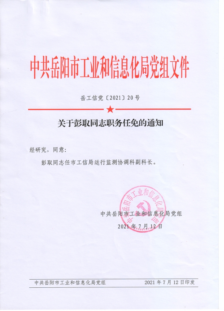 关于彭取同志职级任免的通知
